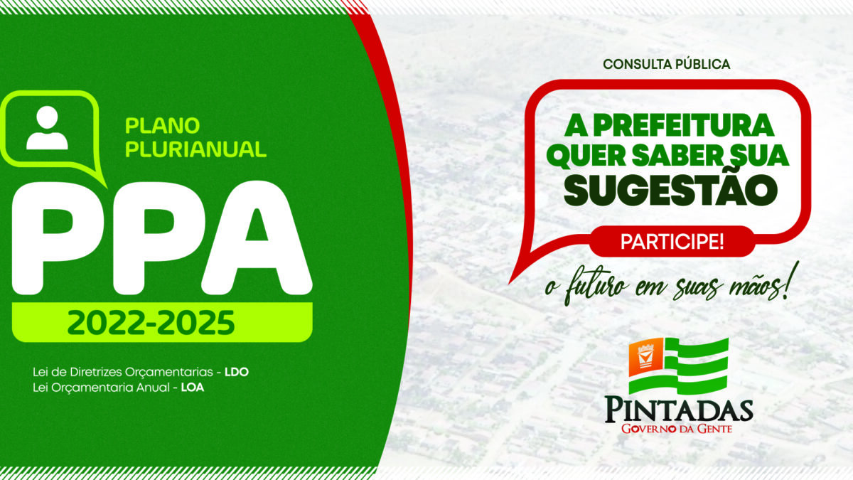 Considerando a pandemia da Covid-19, a Audiência Pública para elaboração dos Projetos da Lei de Diretrizes Orçamentárias – LDO 2022, Orçamentária Anual – LOA 2022 e do Plano Plurianual – PPA 2021, ocorrerá de forma eletrônica. Até dia 27 de abril de 2022, participe e dê sua sugestão para formulação de programas e ações de governo, ou aprimoramento dos já existentes no Município do Pintadas.
